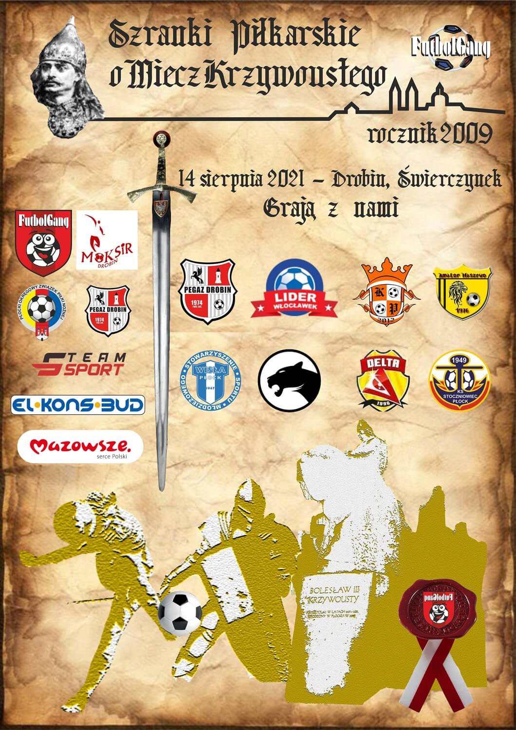 Mamy komplet uczestników w Szrankach Piłkarskich o Miecz Krzywoustego. Oprócz gospodarzy Pegaz Drobin, na pięknych boiskach trawiastych w Drobinie i Świerczynku gościć będziemy Lider Włocławek, AKS SMS Łódź, a co nas niezmiernie cieszy w naszym evencie sportowym zagrają także drużyny z płockiego okręgu: Delta Słupno, Amator Maszewo, Stoczniowiec Płock, Królewscy Płock oraz Stowarzyszenie Sportu Młodzieżowego Wisła Płock.