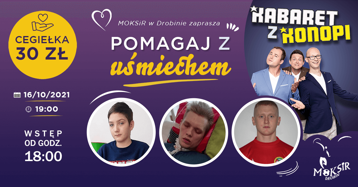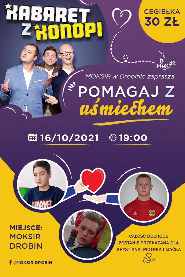 Wydarzenie „Pomagaj z Uśmiechem” będzie imprezą charytatywną, z której cały dochód zostanie przekazany na pomoc w rehabilitacji naszych mieszkańców: Krystiana Dąbrowskiego, Macieja Koziorowskiego oraz Piotra Mielczarskiego. Podczas wydarzenia wystąpi KABARET Z KONOPI !!!